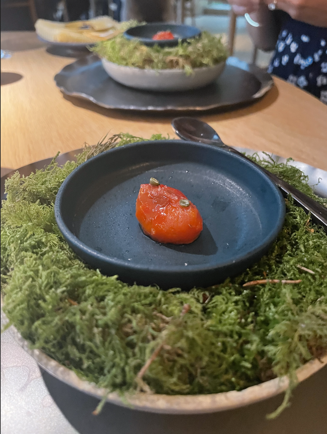 One of my only complaints about Noma is that the hospitality can come off, at times, as cold. When we were first seated our waitress said “I understand this is your first time.” That right there tells you that there is a miscommunication somewhere, or they don’t have a good system of knowing when there are repeating guests, or worse yet they don’t care. We also have noticed that the team plays favoritism to certain guests, whether its Rene Redzepi delivering dishes to certain tables and not others, or certain tables getting special dishes. This creates a feeling, for those of us who don’t receive that treatment, that we aren’t special enough to receive these special items from the team. And maybe we aren’t special, but on a night where you go to a place that you love you want to be treated that way. It’s like when you go to the big dance and see your crush making out with the high school quarterback. This has never set well with me, especially for someone who cares about what Noma means to the culinary world and how important I believe what they are doing with fermentation, foraging, and their work as a whole. I just want them to pretend to care about me as much as I care about them. And maybe that’s not possible, but I don’t think its too much to ask to know that we’ve traveled to Copenhagen three times just to visit Noma that this isn’t our first time at the restaurant.